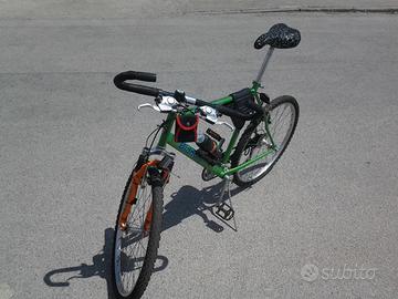 Colorazione verde fluorescente con forcella anteriore arancione ammortizzata (7500 SR Sontour). Freni ProMax e cambio Shimano Acera a 21 rapporti (3 anteriori e 7 posteriori)