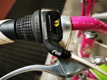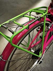 CITY BIKE DONNA – Cerchio 700×38C – FRENI + LEVE: Alluminio – COMANDI: Shimano RevoShift 7 Speed – DERAGLIATORE: Shimano – RUOTA LIBERA: Shimano – GUARNITURA: Alluminio – RUOTE: Alluminio – Attacco Manubrio reclinabile – Pedali Resina Mozzi Alluminio – Porta pacco posteriore in acciaio in tinta verde brillante – Sella in Gel Anatomica – Luci Anteriori & Posteriori con batteria a Led – Axa Block Blocco telaio retraibile completo di catena e protezione anticorrosione. – Colore Bordeaux/rosa Perfetta e funzionante.