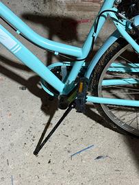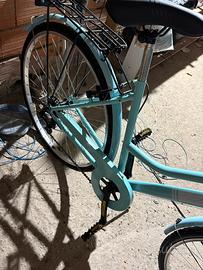 Bicicletta color celestino nuova mai usata, é una bicicletta da città numero 28, Ma il sedile si puó alzare e abbassare quindi é adatta a piu altezze. I freni funzionano tutti e 2 , ha pure un portaoggetti , una luce bianca davanti e dietro uno stop rosso che si illumina con le altre luci. Ha le marce come si vede in foto. L’unica cosa ci sono le ruote da gonfiare perché io non ho la pompetta. Per info contattatemi pure