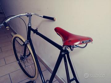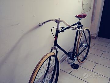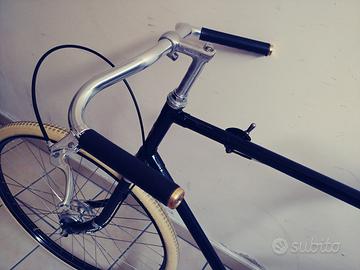 Vendo bicicletta path racer stile Guv'nor con telaio in acciaio brasato a mano, cambio Sturmey Archer SRC3 a tre velocità, freno posteriore a contropedale, freno anteriore a tamburo Sturmey Archer X-RD, sella Brooks, rara leva freno vintage Sturmey Archer, manubrio rivestito in pelle cucita a mano. La bici è stata assemblata con componenti nuovi, ad esclusione della leva cambio e dell'attacco manubrio. Fornisco in aggiunta la leva cambio originale nuova. Gradito incontro di persona in zona Salento.