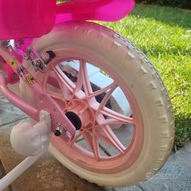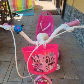 Bicicletta bambina Minnie, diametro ruota 28cm. Con sella e manubrio regolabili. Rotelle incluse removibili. Completa di cestino e porta bambole posteriore. Usata ma in ottime condizioni.