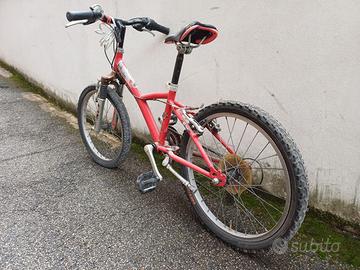 Vendo bicicletta Btwin da bambino/ragazzo con ruote da 20 pollici, ideale per età 6-10 anni. Telaio in acciaio rosso con forcella ammortizzata anteriore e sella regolabile. La bici non è stata utilizzata da qualche anno, freni e gomme sono da sistemare.