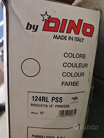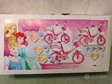 Vendo bicicletta NUOVA ricevuta come regalo doppio al compleanno della DINO BIKES, made in Italy, delle PRINCIPESSE DISNEY, da 12". Mai usata, come da foto del copertone, montata solo per fare le foto, e venduta smontata con scatola originale (è un po' rotta la scatola sopra per una disattenzione in fase di apertura). Valore bici riscontrabile online dai 120€ ai 155€, vendo a 70€! La bici è nuova, mai usata, completa di rotelle e sedile posteriore porta bambola. il cestino avanti rosa invece si è rotto e quindi non è fornibile.