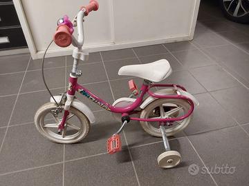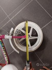 Bicicletta per bambina di colore rosa, con rotelle e porta pacchi sganciabili. Diametro delle ruote circa 20 cm.