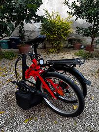 Bicicletta pieghevole B TWIN 500 Decathlon, in ottime consizioni , colore arancio fluo, con accessori ( portapacchi e cestino rigido ) smontabili.