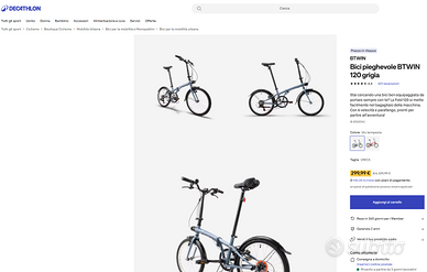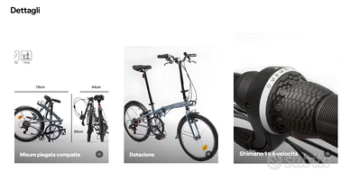 Bicicletta Btwin 120 Pieghevole con cambio a 6 marce Shimano Usata pochissimo Solo adesivo rovinato come da foto. Per il resto perfetta. Manuale di trasformazione, originale, un pò spiegazzato Prezzo attuale Decatlon, in offerta 299€