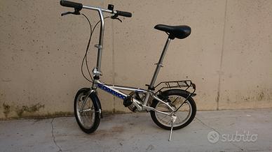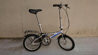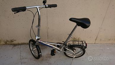 Bicicletta pieghevole Daewoo, tipo Shuttle, usata poche volte, pari al nuovo. Telaio in alluminio aeronautico 6061, leggera, con piantoni manubrio e sella telescopici collassabili, pedali ripiegabili, una volta ripiegata, si può riporre in una sacca. La bici è dotata di portapacchi, cavalletto, registri freni. Ritiro a Milano zona Bande Nere.