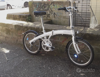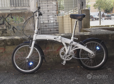 Ottima bici pieghevole DAHON 20 pollici, in alluminio, con 1x8 rapporti. Bianca, con cavalletto, pedali ripieghevoli, con parafanghi e grande e comoda sella. Adatte per tutte le altezze. Usata ma in ottimo stato e tutta funzionante. A Roma, zona Largo Preneste