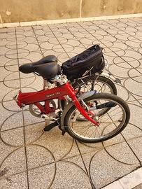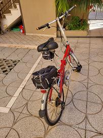 Bicicletta pieghevole, telaio Biologic II interamente in alluminio, reggisella Radius V in alluminio forgiato, sella ammortizzata, cambio Shimano 6 velocità. In aggiunta: campanello, portapacchi, frecce al manubrio (senza batterie), borsetta sottosella e borsa da portapacchi.