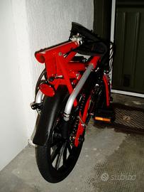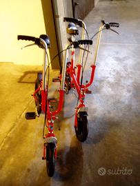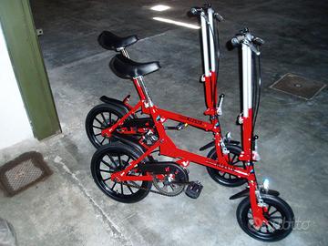 Numero 2 bellissime particolari biciclette pieghevoli e trasportabili marca Samar mod. Risciò. Manovra dia apertura chiusura 15 secondi, ruote con cerchio in allumino e cuscinetti chiusi a tenuta acqua da 16 e 12 pollici, aperta dimensioni massime di ingombro altezza sella cm.90, altezza manubrio cm.110, larghezza manubrio cm.50, lunghezza cm.125, chiusa dimensioni minime di ingombro altezza cm.55, lunghezza cm.80, larghezza cm.35, peso kg.9,5. Come nuove, complete di borsone per il trasporto, perfettamene funzionanti e di minimo ingombro chiuse nel borsone. Euro 240 cadauna.