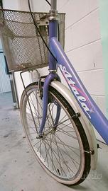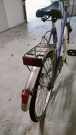 Vendo bicicletta colore lilla, usata ma ben tenuta. Il cestino originale è da cambiare in quanto un po' arrugginito e piegato, da sistemare anche il parafango posteriore.