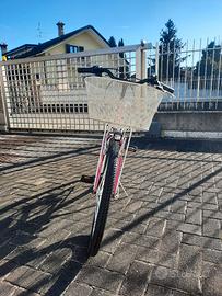 Vendo bicicletta ragazza bianca e rosa, come nuova vedi foto, dotata di cestino bianco anteriore e portapacchi posteriore, età 10-12 anni.