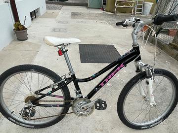 Bici da bambina/teenager marca Trek, modello MT 220, colore nero, con dimensioni 24”. Telaio in alluminio, gruppo cambio Shimano Tourney 21 rapporti, freni al cerchio. La lunghezza della pedivella può essere regolata (127 mm-152 mm). Peso ca. 12,5 kg.non effettuo spedizione