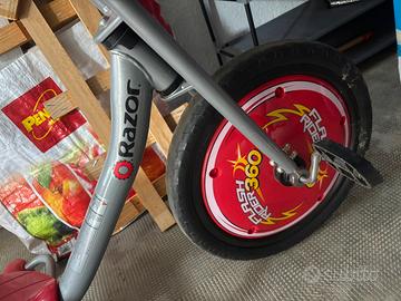 Bicicletta Razor FlashRider 360 per bambini, dal design sportivo e accattivante nei colori rosso e grigio. Un modello unico e super divertente, perfetto per chi ama giocare all’aria aperta in modo dinamico! Grazie alla speciale struttura con ruote posteriori pivotanti, permette di fare giri a 360° e piccoli trick, garantendo ore di divertimento in totale sicurezza. La ruota anteriore grande assicura stabilità, mentre la seduta ergonomica rende la guida comoda e piacevole. ✔ Telaio resistente e di qualità ✔ Manubrio comodo con presa sicura ✔ Ideale per sviluppare equilibrio e coordinazione ✔ Perfetta per bambini che vogliono divertirsi in movimento La bici è in buone condizioni, completamente funzionante, con normali segni d’uso. 🎯 Ottima occasione: stessa qualità del nuovo a un prezzo molto più conveniente!