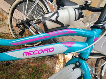 bicicletta record 20" verde acqua e fucsia usata pochissimo, pari al nuovo. cambio Shimano 6 marce. Borraccia nuova mai usata. Cestino. Disponibile per altre foto o qualsiasi chiarimento. CONSEGNA A MANO