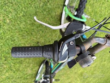 Bicicletta MTB misura 24, telaio in alluminio, con forcella ammortizzata e doppio cambio Shimano. La bici presenta segni di ruggine nelle parti in acciaio, dovuti all’umidità.