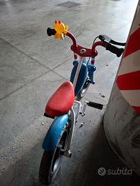 Bicicletta di equilibrio, nelle foto con il blocco pedali che può essere tolto per permettere al bambino di imparare l'equilibrio e poi, montando il blocco, a pedalare. L'ho regalata a mio figlio quando aveva un anno e mezzo e a circa due anni e mezzo sapeva pedalare senza essere mai passato per le rotelle.