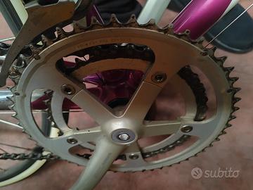 Bicicletta f moser anni 90 alluminio telaio SLX taglia m perfetta, cerchi mavic, pneumatici 700x23 nuovi michelin dynamic sport, sella nuova liberty, grip nuovo selle italia, guarnitura pacco pignoni e freni tutto shimano 105 con cambio al volante. Inoltre pedali spd e regalo scarpe misura 42 vittoria, e rullo per uso indoor regalo borraccia in tinta del giro d'Italia