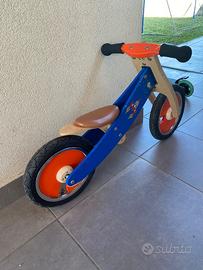 Prima biciclettina in legno senza pedali, leggera e maneggevole, pensata per aiutare i bambini ad acquisire le tecniche di bilanciamento e di equilibrio. Adatta dai 2 anni. Sedile regolabile in altezza. La struttura è robusta e colorata, per offrire un ottimo sostegno senza perdere originalità. L'angolo di sterzo limitato e il manubrio con impugnatura antiscivolo consentiranno al bambino di muoversi ed esplorare in modo sicuro. Dimensioni : 83x54x37 cm. Unico difetto la parte destra del manubrio è leggermente crepata ma ugualmente pienamente funzionante e L utilizzo non è minimamente compromesso (vedi foto).