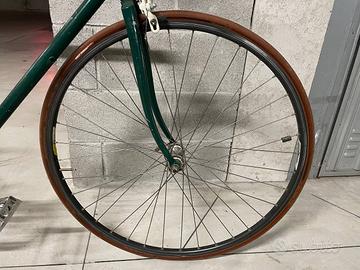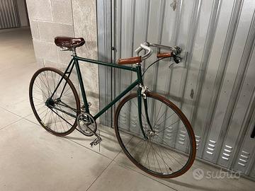 Biciletta da città in stile vintage single speed (ma adattabile con deragliatore, doppia corona anteriore e 3 velocità posteriori), cerchi da corsa Campagnolo vintage, sella Aquila Superflex, freno anteriore. La bicicletta é globalmente in buono stato estetico ma la vernice é intaccata in alcuni punti.