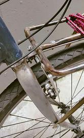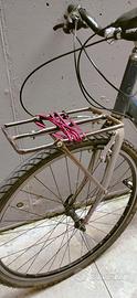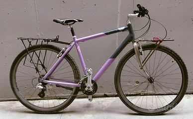 Bicicletta Specialized Crossroads del 2005, telaio in alluminio e forcella in acciaio, sverniciata e riverniciata a liquido da me stesso (la forcella con del trasparente protettivo). Pedivelle sostituite con delle Shimano. Cerchi da 28" con gomme 700x42. Portapacchi posteriore originale, anteriore costruito e saldato da me stesso in acciaio nudo ma trattato antiruggine. Meccanica perfetta, solo un po' sporca.