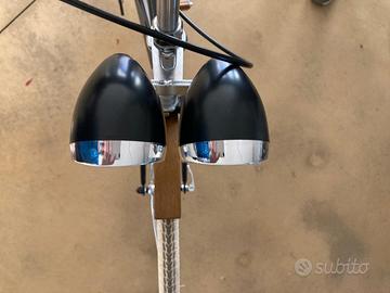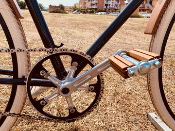 Vendo bellissima bici telaio datato 1975. Tutto rigorosamente fatto a mano compresi i componenti in legno: Verniciatura e finitura fatta in forno (no bombolette); Manubrio in legno; parafanghi in legno ; Pedali in legno fatti rigorosamente a mano; Borsa in vitello removibile e comprensiva di tracolla, fatta da pellettiere appositamente per la bici; Componentistica: Cerchi in alluminio neri verniciati a polvere; Guarnitura 52/42 Vintage marca Campagnolo Super Record De Rosa L'Eroica inserti neri originali; Catena bicolore nera/argento; Attacco manubrio bicolore nero/argento attacco manubrio marca 3tt; Pneumatici beige; 2 fari. Sella DEI; La bici realizzata e non è stata mai utilizzata tranne che per la prova in strada