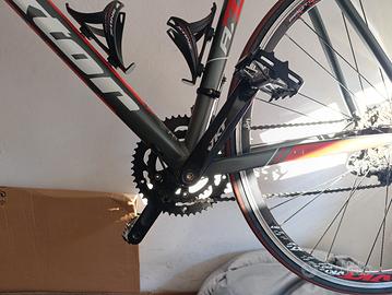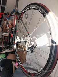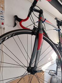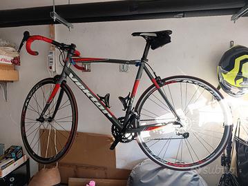 Alluminio, molto leggera, cambio Shimano Tiagra con leve al manubrio integrate con leve freni, misura M, completa di pedali con attacchi marca Look e pedali normali, doppio porta borraccia già montato, libretto. Usata pochissimo e tenuta sempre sospesa da terra. Vendo causa inutilizzo.