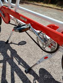 Bicletta tandem acquistato nel 1987, in eccellenti condizioni, priva di difetti meccanici e usata meno di 5 volte. Include campanello e porta borraccia. Ha un fanale anteriore e un perfetto battistrada. I sellini sono in pelle, molleggiati e ha due cavalletti in tinta, praticamente nuovi. È perfetta per uscite, concorsi, servizi fotografici, pezzi di ricambio o per collezione personale. È molto leggera ed è stata completamente fabbricata in Italia dalla ditta VETTA di Antonio Taverna (sono ancora in attività, hanno un sito su Google, se cercate maggiori informazioni), marchio pioniere dietro la produzione delle bici più prestigiose, vantando una qualità manifatturiera come solo il reale made in Italy può garantire.