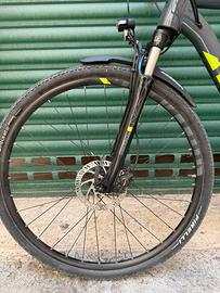 Bicicletta Raymon da trekking/cicloturismo. Componentistica Shimano (cambio Acera 24 velocità), freni a disco idraulici, forcella anteriore ammortizzata, dinamo nel mozzo anteriore, copertoncini Pirelli gravel. Adatta a persone alte 175/185 cm, manubrio regolabile, sella comoda.