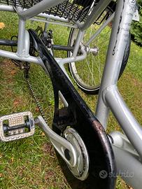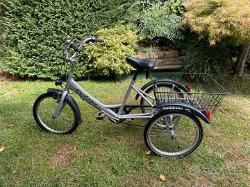 Vendo Bicicletta/Triciclo a tre ruote per adulti, in buone condinzioni, adatta anche per gli anziani. Cambio con manopola a 6 marcie, freno a disco posteriore, cestello per caricare oggetti, blocco freno per lo stazionamento. Colore grigio, catarinfragenti posteriori rossi e faro anteriore.