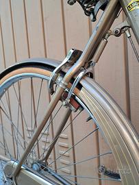 Vendo bicicletta epoca con freni a bacchetta marca Umberto Dei modello Imperiale con ruote misura 28. Bici in rara colorazione bronzo con cromature in ottime condizioni, normali segni di utilizzo. Bicicletta con frenata integrale dal fascino di altri tempi (datata anni 90). Segnalo come evidente in foto sella originale U.DEI sgualcita da riparare o sostituire e la mancanza della gemma faro posteriore. Prezzo trattabile. Possibilità di presa visione e prova al mio domicilio Cinisello Balsamo.