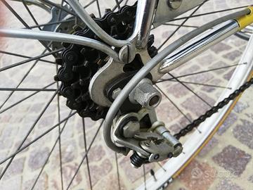 Vendesi per inutilizzo bicicletta da uomo da passeggio/turismo, marca "Stella del Nord" tipo "Condorino" mod. "Velox Sprint", allestimento "sport", manubrio "condor", sella "touring", colore oro metallizzato, vintage anni '90, usata pochissimo, in ottimo stato, gomme nuove (sostituite estate 2022, costo 50 euro, km zero), cambio "Campagnolo Valentino Extra" a 5 marce, accessori (impianto luce ant. e post. con dinamo, campanello, parafanghi cromati). Disponibile per visione e prova a Sabaudia (LT).