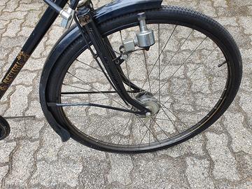 Vecchia bicicletta da uomo, colore nero, doppia canna, freni a bacchetta che agiscono su freni a tamburo sulle ruote (molto potenti), doppio cavalletto, catena coperta per non sporcarsi, molto robusta ed usata pochissimo.