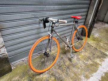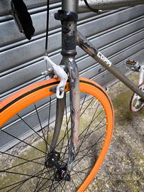 Sei alla ricerca di una bicicletta Coppi urbana unica nel suo genere, leggera e scattante per dominare le strade cittadine? Questa è l'occasione che fa per te! Questa single speed non è solo un mezzo di trasporto, ma una dichiarazione di stile. Con la sua ruota posteriore flip-flop, puoi passare facilmente dalla comodità della single speed all'adrenalina dello scatto fisso. Che tu stia pendolando per andare al lavoro o esplorando la città, questa bici ti porterà ovunque con stile. Il pezzo forte di questa bici è il suo look "rustico/industrial". Il telaio ha una finitura opaca e autentica che non passa inosservata. C'è un unico difetto sulla forcella anteriore: la vernice è rovinata (come mostrato chiaramente nella foto dettagliata), conferendole un carattere unico e vissuto. Se sei un amante del "lo voglio ma che sembri usato", questa bici è perfetta per te!