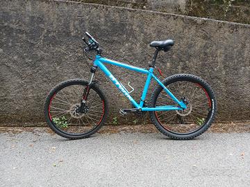 Bicicletta usata mountain bike B'Twin Rockrider 500. È una bicicletta con telaio in alluminio, forcella ammortizzata e ruote da MTB, adatta per percorsi fuoristrada. Senza cavaletto. Con ruote da 26 pollici.