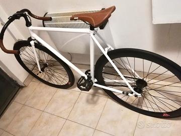 Vendo causa trasferimento in zona collinare bicicletta scatto fisso manubrio da corsa vintage. Perfetta in ogni dettaglio: Ingranaggi come nuovi, sempre oliati e registrati neanche un graffio. Freno posteriore a pedale. Colore telaio: bianco lucido. Sellino antiurto in cuoio. Ruote in alluminio, copertone slim a fascia allargata. Possibilità di spedizione con costo a carico dell’acquirente. Altezza telaio tubolare 55cm. Altezza sellino 90cm