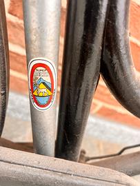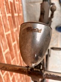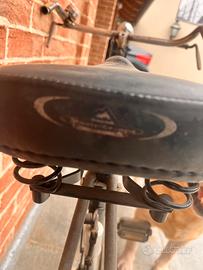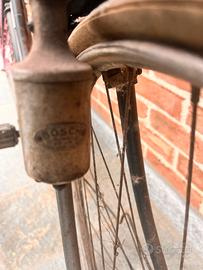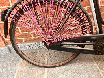 Classica bicicletta vintage da donna, probabilmente risalente a metà del secolo scorso, caratterizzata da un fascino d'altri tempi. Ecco alcuni dettagli interessanti che saltano all'occhio: • Il Coprigonna (Skirt Guard): Quella rete rosa sulla ruota posteriore non è solo decorativa; serviva a impedire che le gonne lunghe o i cappotti finissero tra i raggi durante la pedalata. È un dettaglio tipico delle bici da città dell'epoca. • Il Telaio: La forma curva del tubo principale (telaio "a cigno" o "drop frame") era pensata proprio per permettere alle donne di salire e scendere agevolmente anche indossando una gonna. • Componenti d'epoca: Si vedono chiaramente il faro anteriore a dinamo (molto grande, tipico dello stile retrò) e il manubrio con i freni a bacchetta, un sistema meccanico che agisce direttamente sui cerchi tramite leve rigide invece dei moderni cavi d'acciaio.