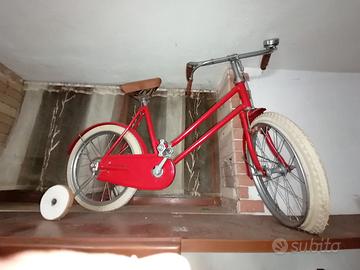 Bicicletta bambino vintage, con freni a bacchetta e rotelle in legno, introvabile. Da ricerche risulta del 1923 e ne è rimasta soltanto una al Museo della Bicicletta. Condizioni buone con ovvi segni del tempo.