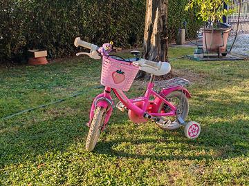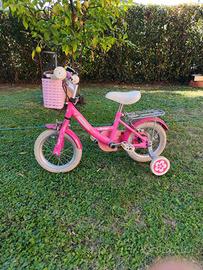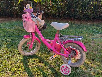 Bicicletta per bambina, 3-5 anni 7-8 kg, telaio in acciaio verniciato rosa, sella imbottita regolabile, cestino anteriore in plastica, rotelle laterali rimovibili, alcune ammaccature su parafango posteriore. Da aggiungere eventuali spese di spedizione.