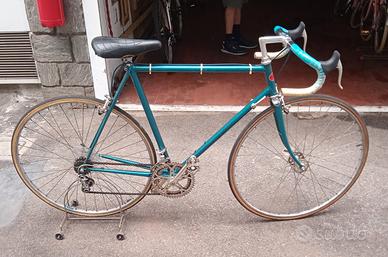 Bici da corsa vintage, anni 70, colore acqua marina. Leggerissima. Cambio Campagnolo, 2 corone anteriori e 5 rapporti. Ruote Palmer, da 28