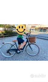 Bicicletta da donna color petrolio con sella marrone, senza cestino.usata poco