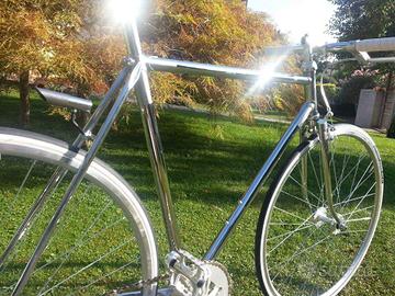 Ho realizzato questa bicicletta partendo da un Superba con telaio in acciaio Krupp. Il telaio è stato sabbiato e completamente cromato in bagno a spessore (cromatura liscia e satinata). Montata con accessori nuovi di prima qualità: - cromatura 300 euro - freni 80 euro, - movimento centrale 30 euro, - guarnitura 80 euro, - cerchi alto profilo con mozzo flip flop 180 euro - sella Fizik 120 euro - canotto sella nuovo 35 euro - canotto sterzo d'epoca Pivot 50 euro - coppia pedali 45 euro - leva freno anteriore in alluminio artigianale - serie sterzo 30 euro - catena 25 euro Inoltre ho realizzato il porta oggetti in legno (rimovibile). La bici ha fatto forse 30 km ed è stata utilizzata parecchio tempo quale complemento d'arredo in un negozio. Vendo perché devo fare spazio e non la uso.