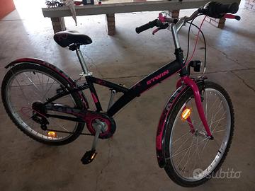 Bicletta per bambina B'TWIN Decathlon Poply 500 24". Ottime condizioni. Cestello grigio in aggiunta da attaccare volendo al manubrio. Per bambina/ragazza circa 8–12 anni. In ottime condizioni generali, perfettamente funzionante e pronta all’uso. Caratteristiche tecniche: - Ruote da 24” - Cambio a 5/6 velocità - Freni V-brake - Sella ampia e confortevole - Parafanghi anteriori e posteriori - Cavalletto laterale - Campanello - Copertoni adatti a strada e sterrato leggero Consegna: a mano zona Isolotto, Firenze Posso fare altre foto su richiesta. Per altri dettagli scrivermi in privato.