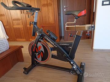 Bike Carnielli praticamente nuova utilizzata 2 volte. Ingombro L. 1070 x P.510 x H. 1150 mm. Non spedisco ritirabile sul posto. Freno a tampone, regolazione micrometrica tramite manopola, 22 kg massa volanica, peso massimo utente 125kg, regolazione sella e manubrio, rivelazione cardiaca.