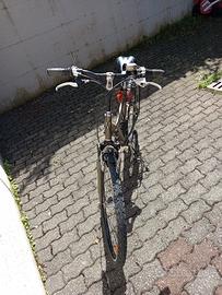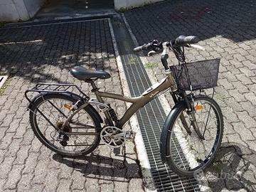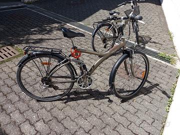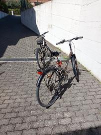 Una bici è da 26" con portapacchi anteriore e posteriore più cestino, la seconda è da 28" e ha il portapacchi posteriore