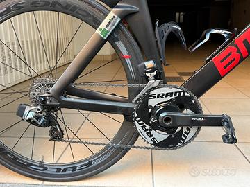 Vendo bici da crono e triathlon Bmc Timemachine 01, taglia M / L (Altezze 1.76 - 1.84). -Telaio top di gamma con manubrio versione PRO -Cambio Sram Red 11v elettronico wireless, rapporti 54-39 e 11-28, pedivelle 170mm -Misuratore di Potenza Quarq integrato -Ruote Fulcrum Racing Speed da 50mm Ottime condizioni generali, bicicletta tenuta molto bene.