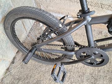 bmx colore grigio misura 20 pollici con pedane montate sulla parte posteriore. Priva di freno anteriore.