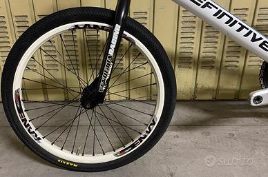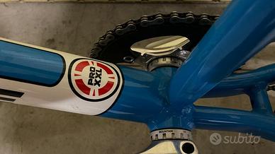 manubrio Vendetta American Bar Black, forcella Vendetta Tommy Gun Black, attacco manubrio MacNeil Top Notch BMX Stem Red, freno Shimano Dxr Silver, sella GT, movimento centrale Shimano DXR, corona FSA 42, cerchioni Envy e Mozzi Bombshell, copertoni DTH in Kevlar, colore bianco/azzurro