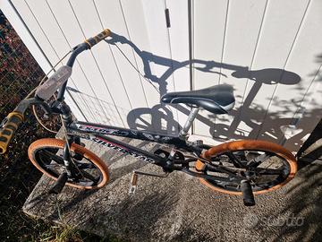 Bmx freestyle montata con: telaio in acciaio, doppio freno a disco, cerchi a raggi in alluminio, pedaline.