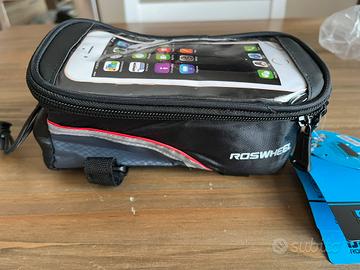 Vendo borsa per bicicletta con porta cellulare con schermo touch che permette l'uso nella custodia. Idrorepellente e con adattatore e prolunga cuffie cellulare.